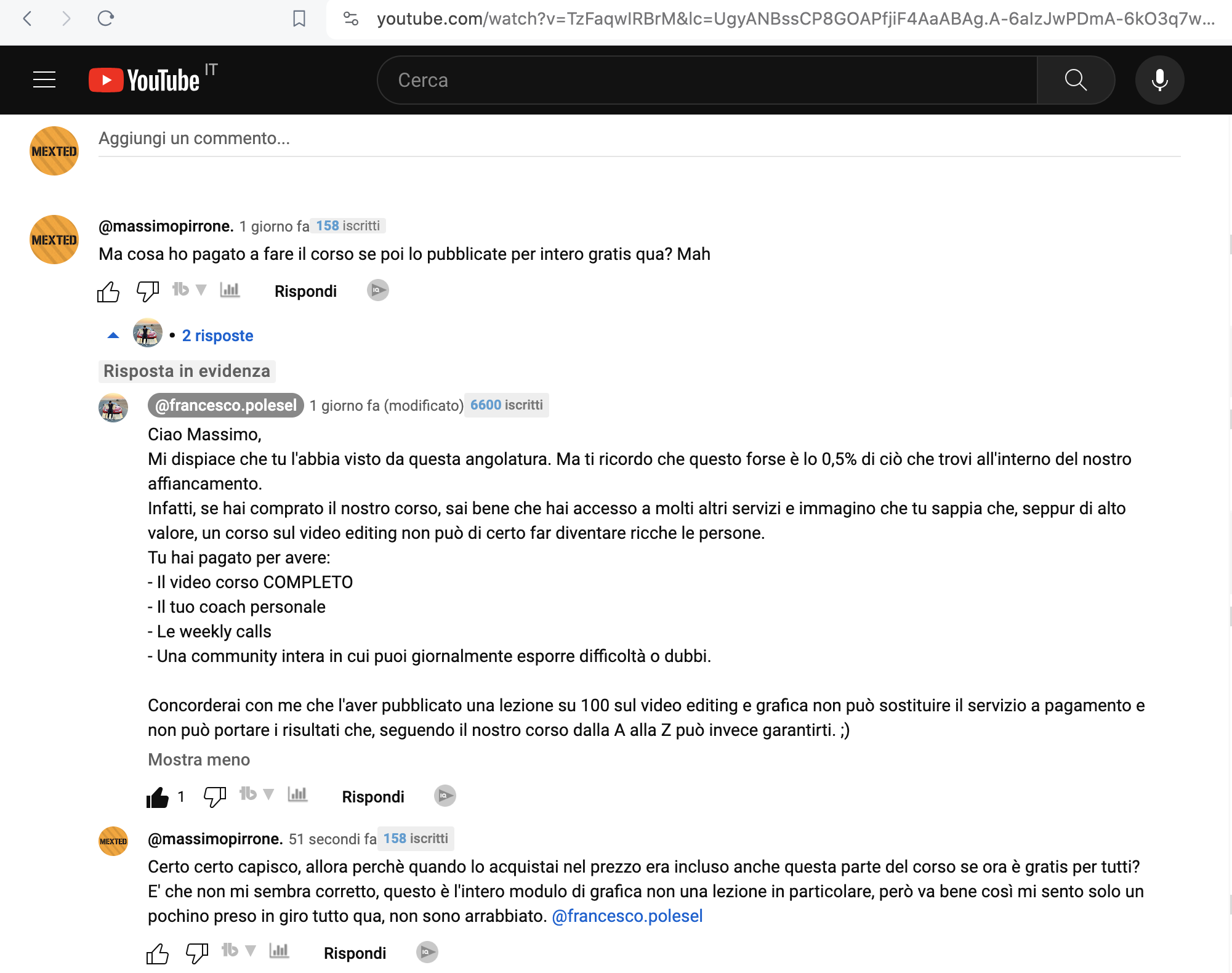 Ciao, sono uno studente della loro university da agosto 2023, sono molto disponibili rispondono subito se hai un problema si impegnano ad aiutarti a risolverlo, ultimamente devo esprimere il mio disappunto quando pochi giorni fa è stato pubblicato sul canale yt di Francesco, non una lezione ma L’INTERO MODULO di grafica del corso, e sembra che l’unico a sentirsi preso in giro sia io, ti lascio la risposta di francesco stesso.