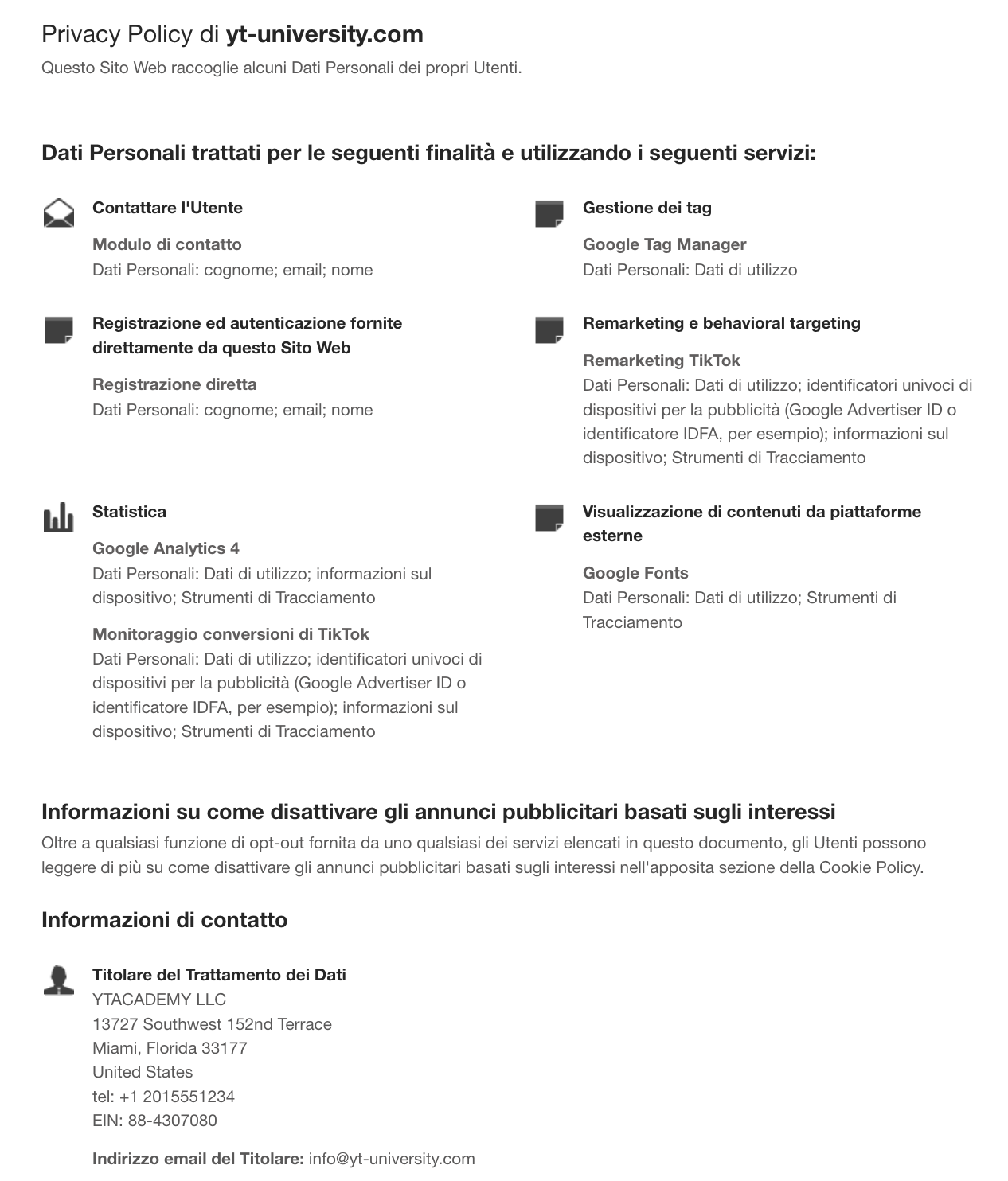 ytuniversity.it. Sito .it (whois nascosto), senza partita iva, senza dati, privacy policy/dati/cookies che addirittura escono dal sito, per finire su iubenda.com, e nello stesso riportante dicitura yt-university.com (quindi .com, con whois semi nascosto, registrato su godaddy) e ‘questo sito’ (ah quindi iubenda?) come riferimento ai dati trattati. Sembrerebbe abbiamo lasciato pure i campi generici, come da inserire, tipo: ‘nome, cognome’.