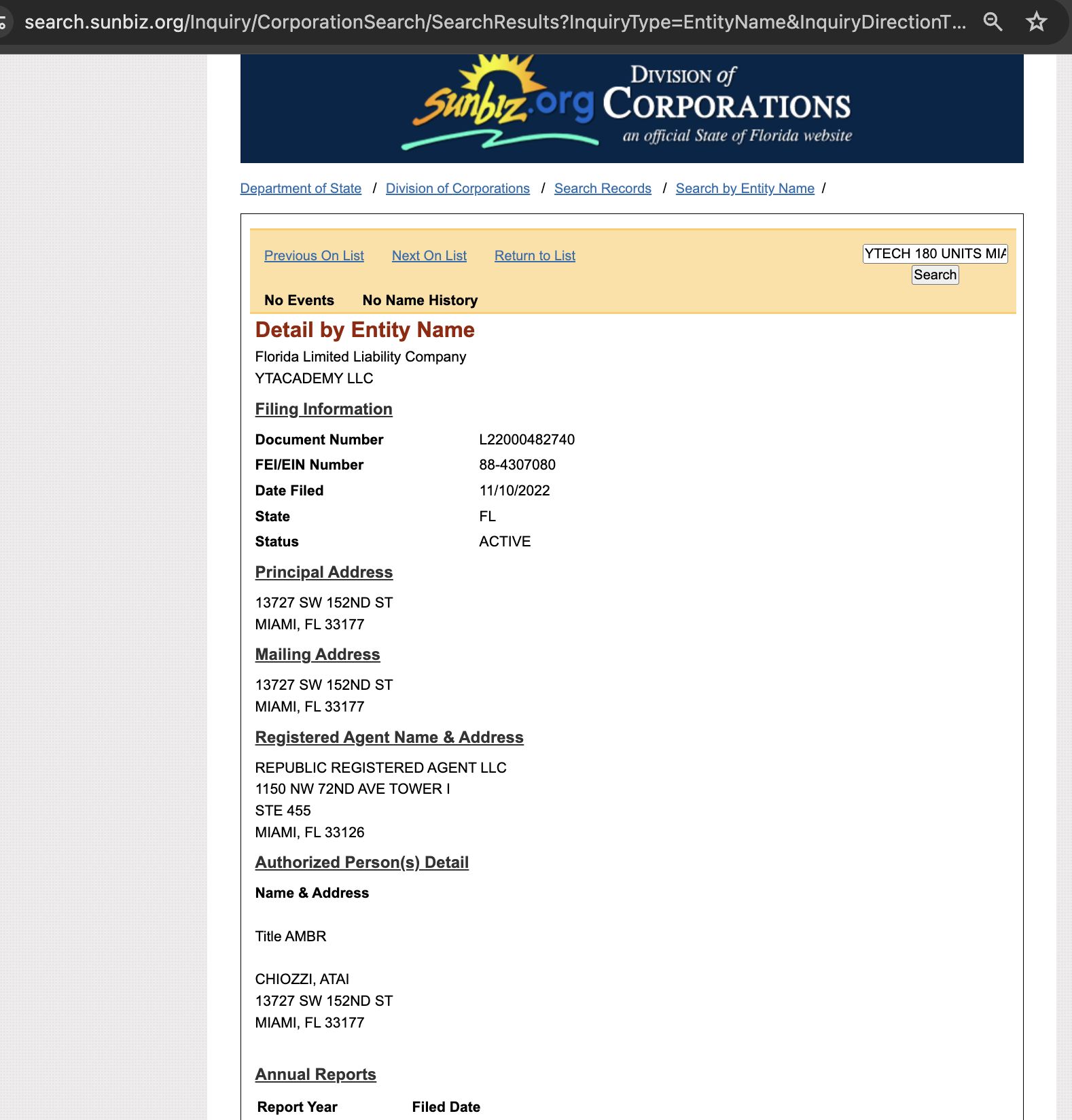 società YTACADEMY LLC registrata a Miami (loro invece si filmano da Dubai), l’indirizzo “13727 Southwest 152nd Terrace, Miami, Florida 33177” è un centro commerciale (c’è un secondo indirizzo meno chiaro appena a lato).